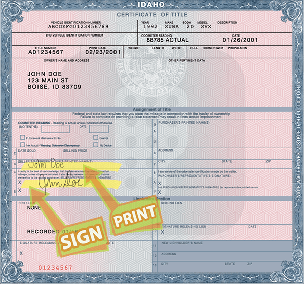 We have provided a picture of a sample Idaho vehicle title. The arrow is pointing to the location for your signature. Make sure you sign the title with the name listed on the front page of your title. When the tow driver comes to pick up your vehicle, you should turn over the signed title to the driver at that time.